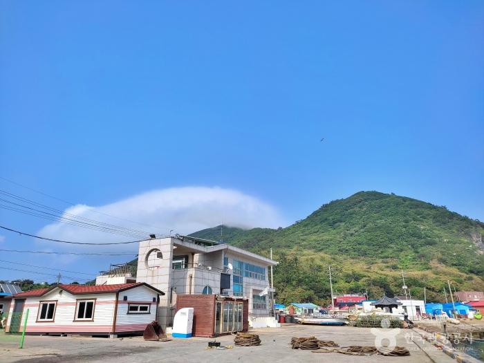 파도를 헤치고 섬에 이르면 자그마한 항구 가까이 구름 모자를 쓴 봉화산이 반겨줍니다.