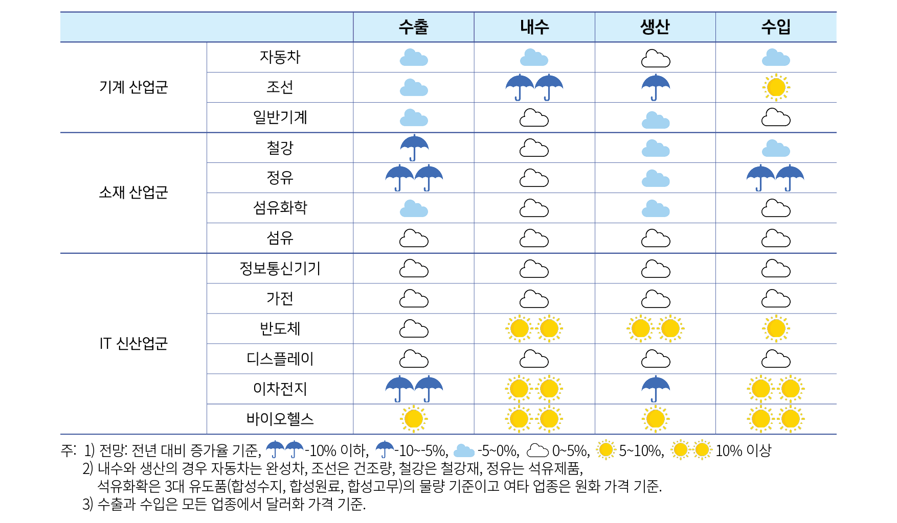 소재산업군의 경우 섬유는 0.9% 소폭 증가로 전환되는 반면 정유 -16.3%, 철강 -5.0% 및 석유화학 -2.0%의 수출 감소 추세가 지속되며 전년 대비 7.6% 감소할 것으로 보입니다.