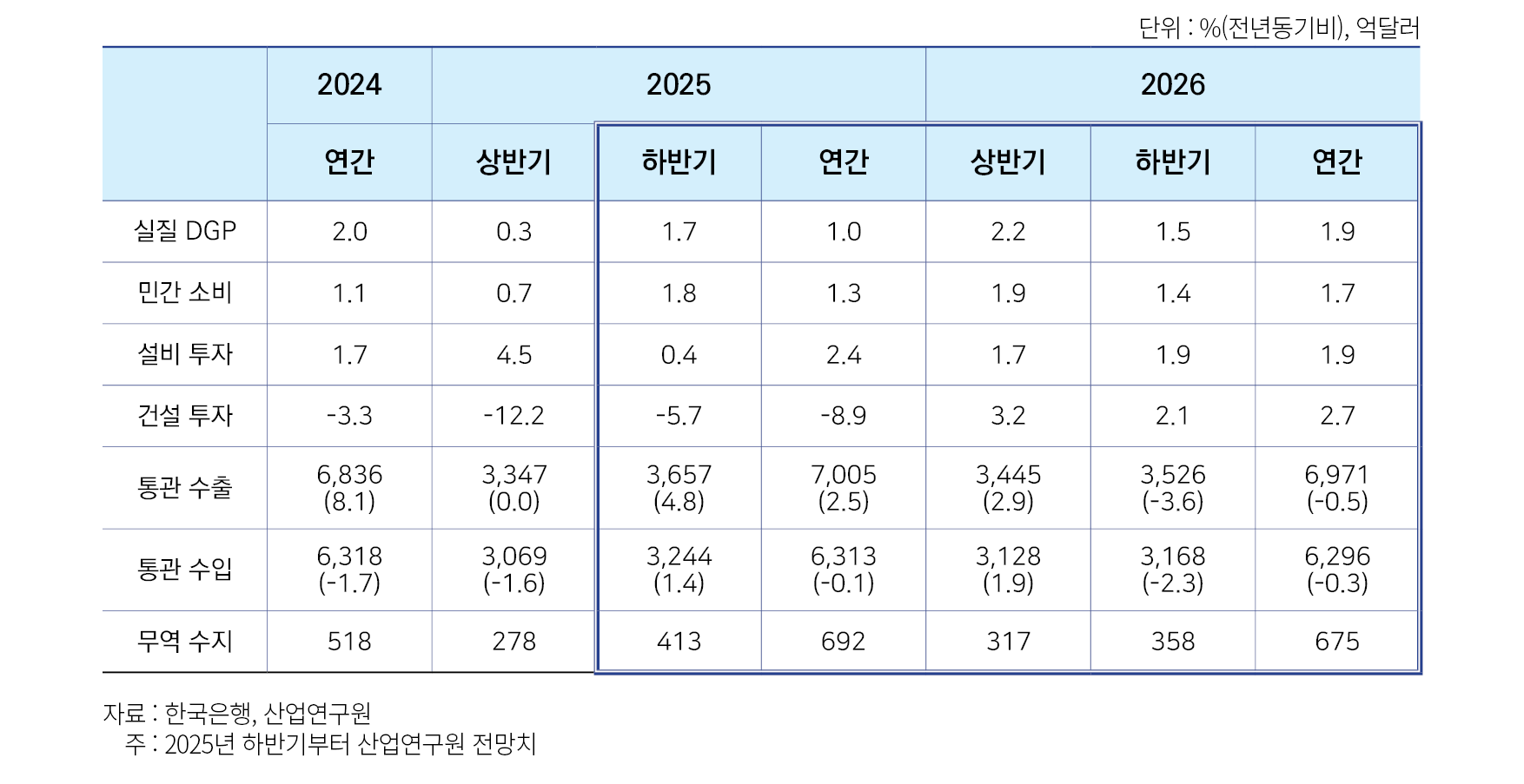 수출(통관 기준)은 주요국들의 경기 부양 기조, 글로벌 무역 불확실성의 일부 완화, AI 관련 반도체 수요 증가세 등이 긍정적 요인으로 작용하지만 글로벌 경기 부진 및 교역 둔화, 전년도의 호실적에 따른 기저효과 등으로 전년 대비 소폭 감소를 예상했습니다.